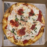Light sauce, sliced fresh tomatoes, fresh mozzarella & fresh basil.